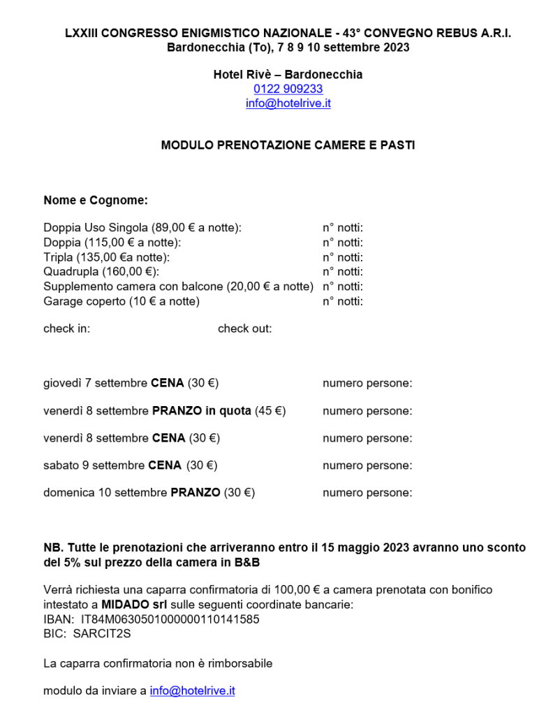 Le prenotazioni delle camere e dei pasti devono essere inviate, con email all’indirizzo info@hotelrive.it , direttamente all’Hotel tramite il modulo che potete scaricare qui sotto